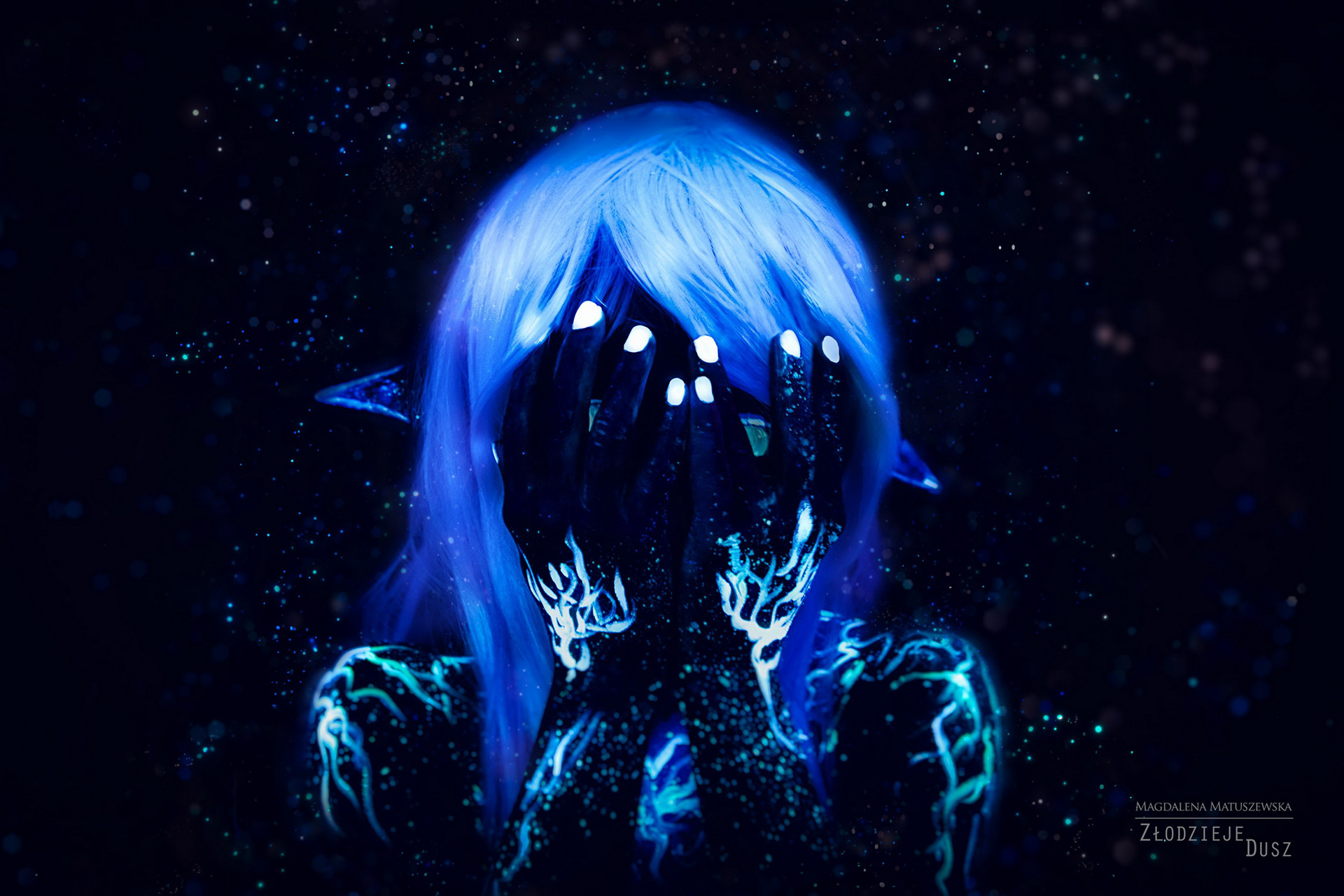 Chciałam spróbować czegoś nowego - zdjęć w ciemności z wykorzystaniem farb oraz elementów charakteryzacji świecących w UV. Punktem wyjścia było tu rozświetlone nocne niebo.